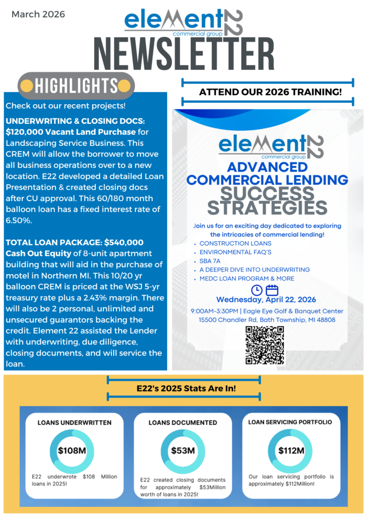 Happy March! E22’s 2025 stats are in and we want to thank you for another great year. Our Spring training registration is open! You can register here: https://element22commercial-advancedcommerciallendingsuccessstrategies.eventbrite.com